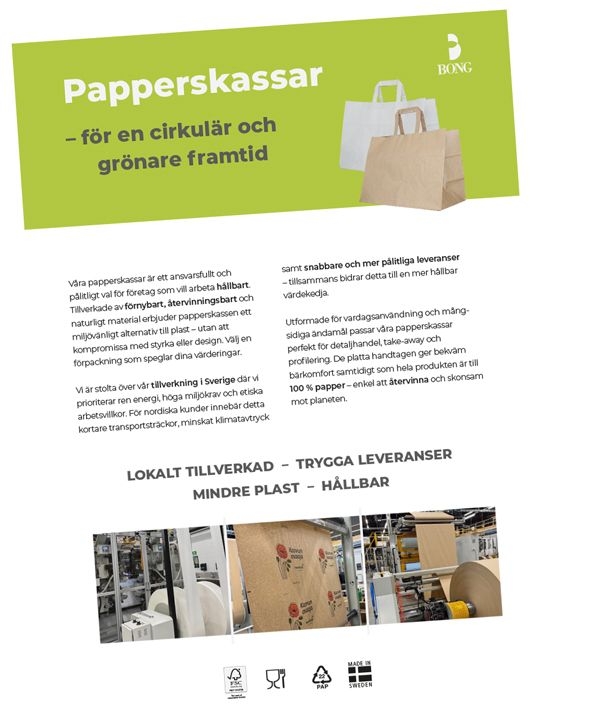 Våra papperskassar är ett ansvarsfullt och pålitligt val för företag som vill arbeta hållbart. Tillverkade av förnybart, återvinningsbart och naturligt material erbjuder papperskassen ett miljövänligt alternativ till plast – utan att kompromissa med styrka eller design. Välj en förpackning som speglar dina värderingar. Utformade för vardagsanvändning och mångsidiga ändamål passar våra papperskassar perfekt för detaljhandel, take-away och profilering. De platta handtagen ger bekväm bärkomfort samtidigt som hela produkten är till 100 % papper – enkel att återvinna och skonsam mot planeten.